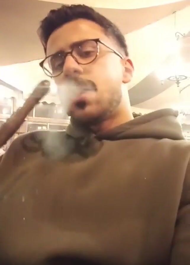 man smoking a hookah. He is wearing glasses and a dark green hoodie. He exhales a large cloud of smoke. The camera then moves down to show the table where he is sitting, and then to his legs. He is wearing gray pants and gray shoes with white socks. The background is blurry, but it appears to be a restaurant or cafe with other people present.