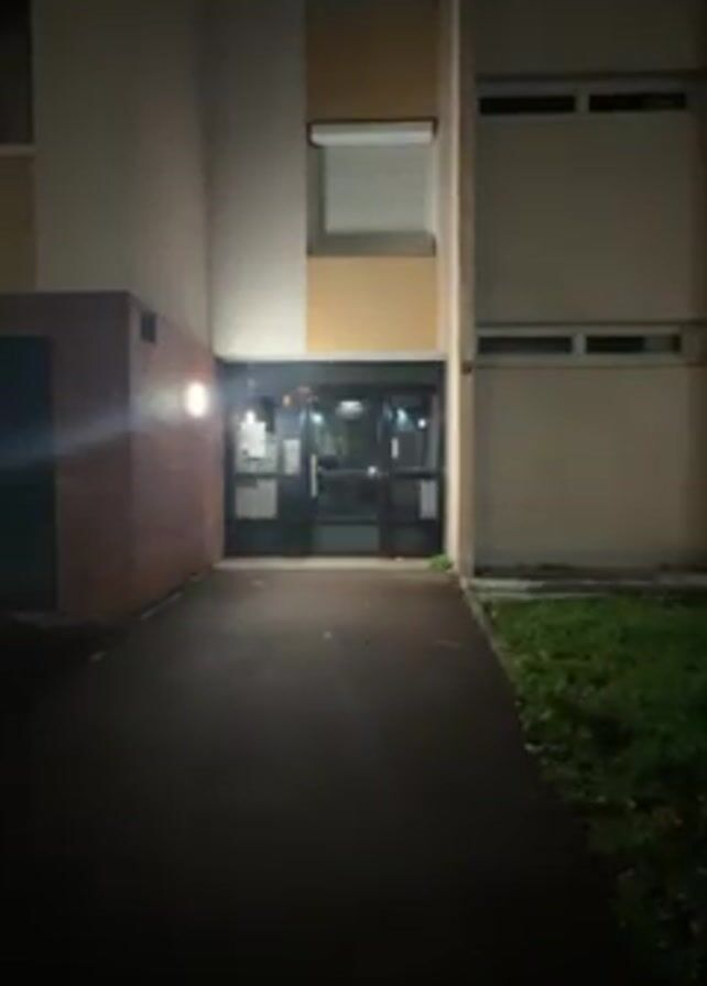 The scene is a nighttime exterior view of an apartment building entrance. The building is illuminated by dim exterior lights, casting shadows across the pathway leading to the entrance. The entrance consists of glass doors framed by dark metal. To the left of the entrance is a brick structure, and to the right is a patch of grass. The overall atmosphere is quiet and dark.