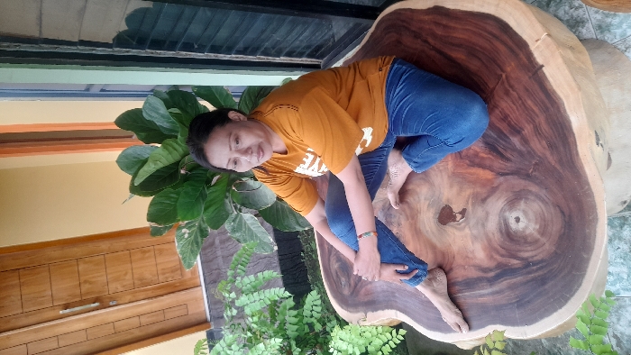 In Kecamatan Pati, Indonesia, an adult female is seated barefoot on a large, irregularly shaped natural wood slab