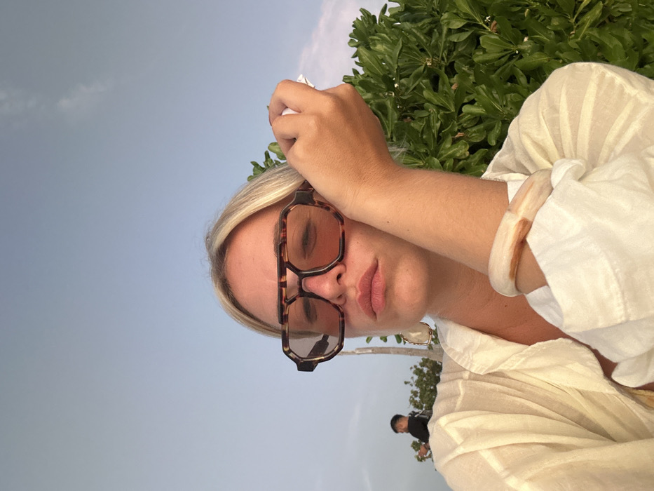 A blonde female is depicted in a close-up, outdoor setting in Maafushi, Maldives, under a clear, light blue sky. She wears large, tortoise-shell frame sunglasses with brown-tinted lenses and a light-colored, possibly white or off-white, striped long-sleeved button-up shirt. Her right arm is raised with her hand resting near her right temple. A light-toned bangle, appearing to be made of wood or bone, is on her right wrist, and a large, light-colored earring is visible on her left ear. Her lips are slightly pursed, and her gaze is directed towards the camera. The lighting suggests late afternoon. Dense green foliage occupies the right mid-ground and extends into the left mid-ground. In the distant left background, a male individual with dark hair, wearing a dark shirt, is partially visible, appearing to be standing or seated on an elevated structure.