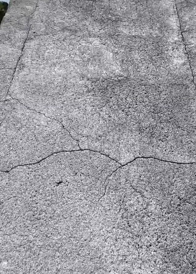 concrete platform extending into a body of water. The platform has several cracks running across its surface. The water reflects the sky, creating a blurry mirror image of clouds and perhaps a mountain or hillside.
