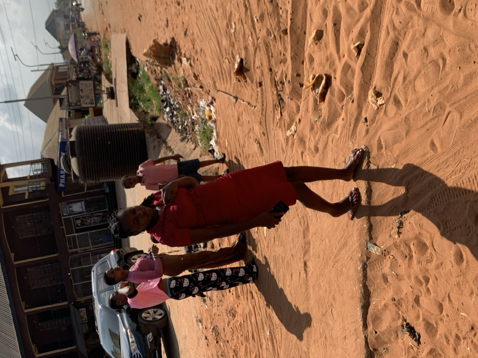 The image captures a street scene in Aguleri, Nigeria, under bright daylight conditions. The foreground consists of reddish-brown unpaved earth with visible tire tracks, foot traffic indentations, and scattered light-colored debris. Five individuals are present. In the immediate foreground, a female wearing a short-sleeved red dress and brown flip-flops stands with her head slightly tilted down. She holds a dark smartphone in her left hand and her right hand is placed on her upper chest. Her shadow is cast prominently to her left. Behind this individual, on the left side of the frame, are two other females. One wears a light pink t-shirt and black pants with white Hello Kitty patterns, with her left arm raised towards her head. The second female, positioned slightly behind her, wears a light pink long-sleeved top and long brown pants. To the right, across a shallow, debris-filled, concrete-lined drainage ditch, a young male in a light pink t-shirt and blue shorts stands. In the mid-ground on the left, a dark-colored SUV, possibly a Toyota Highlander, is parked alongside a two-story building featuring a dark brown facade with orange trim. The ground floor of this building houses a business with a partially visible sign reading "PHARMACY." Adjacent to the building, a large, black, ribbed water tank rests on a concrete platform. Further down the unpaved road, additional buildings, utility poles with streetlights, and an umbrella-covered vendor stall are visible. The sky is partly cloudy.