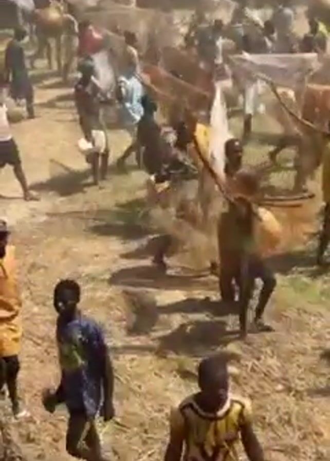 A medium, high-angle shot shows a large group of people walking across a grassy field. Most of the people are carrying fishing nets and large, round objects, possibly gourds or containers. Some are wearing yellow clothing. The field is covered with dry grass and straw. In the background, there are blurred structures and signs. The scene appears to be a cultural event or festival involving a traditional fishing activity.