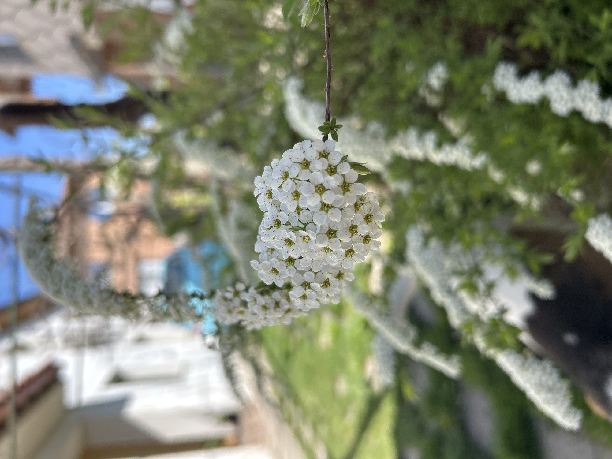 A close-up shot shows a cluster of small white flowers hanging from a thin brown stem, with a few small green leaves at the top. The background is a blur of green foliage and other white flowers. In the out-of-focus background, there is a suggestion of buildings with brown roofs and blue sky. This is consistent with an urban environment in Krumovo, Bulgaria.