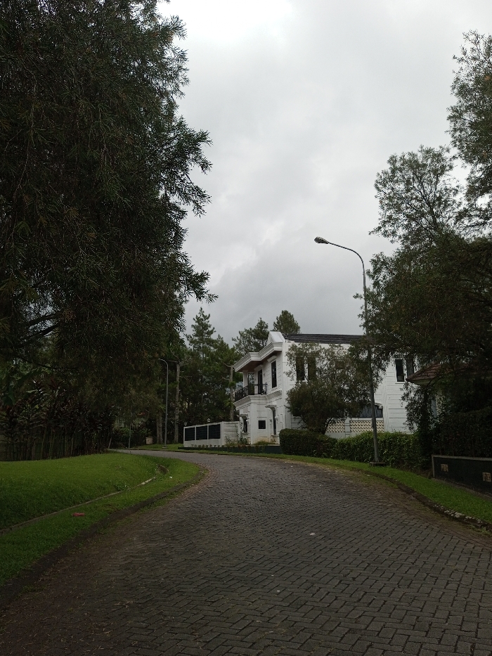 A cobblestone road winds towards a white house with a dark roof. The sky is overcast. Tall trees flank the road on both sides. A street lamp stands near the house. Green grass lines the roadside, with a slight elevation change forming a gentle hill on the left. The architecture of the house includes a balcony and decorative elements. A low fence is visible in front of the house.