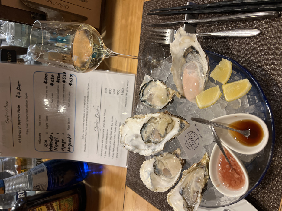 The image displays a close-up, eye-level view of a dining arrangement in a restaurant or bar located in Osaka, Japan. The central subject is a blue-rimmed glass plate containing five raw oysters on the half-shell, presented on a bed of crushed ice. A small white card bearing the "Hiro Akira" logo is partially visible among the ice. Four lemon wedges are arranged around the oysters. To the left of the oyster plate, two small, elongated white dishes hold sauces: one contains a reddish liquid, and the other a dark, soy-based liquid, each equipped with a small spoon. To the right, a stemmed wine glass, partially filled with a pale yellow liquid, is positioned on a brown woven placemat. Adjacent to the glass, a silver fork, a slender silver knife, and a pair of black chopsticks (resting in a holder) are arranged on the placemat. Behind the oyster plate, an upright white menu titled "Oyster Menu" is prominently displayed. It lists a "5 kinds of Oysters Plate" for ¥2,600 and individual oyster types such as Hokkaido, Hyogo, and Nagasaki, with prices ranging from ¥550 to ¥650. A section for "Oyster Dishes" and a warning regarding raw oyster consumption are also visible. The background is dimly lit, revealing several bottles on a shelf or bar, including a distinct blue glass bottle, consistent with a restaurant or bar environment. The table surface appears to be wood. No people are visible in the scene.