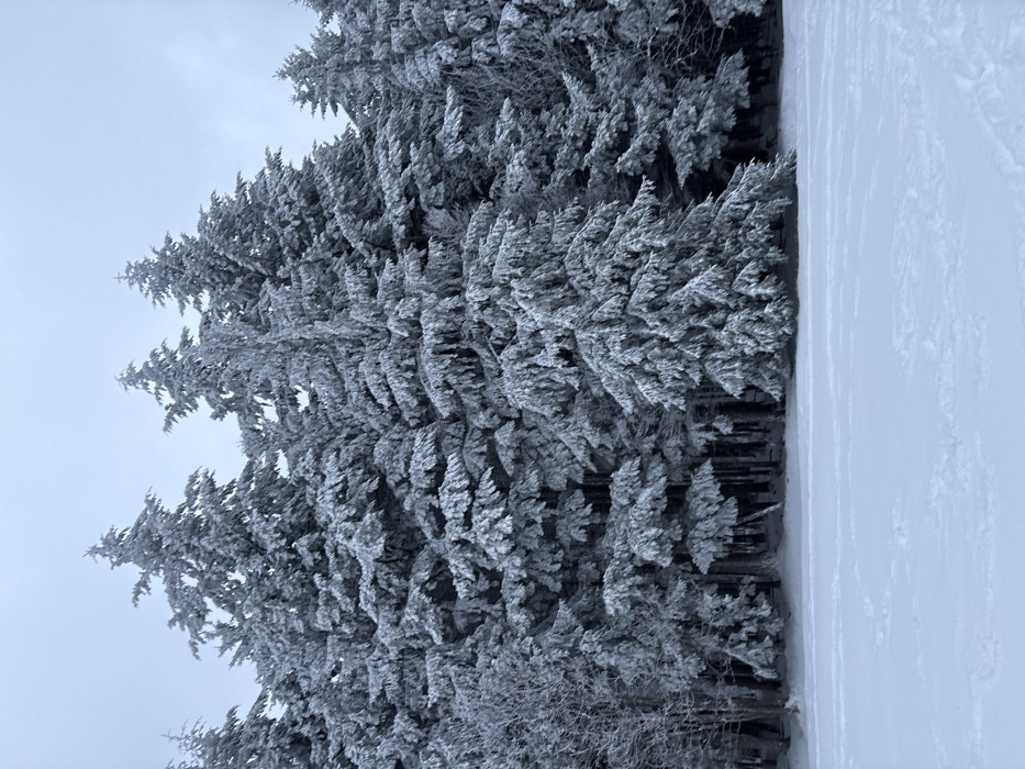 This image depicts a winter landscape in Le Hohwald, France. The scene is dominated by a dense coniferous forest, with all trees heavily coated in fresh snow or hoarfrost. The foreground consists of a vast, flat expanse of undisturbed white snow, exhibiting subtle texture variations. No individuals, animals, or artificial structures are visible. The trees, primarily evergreens, appear uniformly white due to the snow accumulation on their branches, needles, and trunks, with some darker foliage visible underneath the snow layer. A few bare, snow-dusted deciduous branches are discernible on the far left of the tree line. The sky above is a uniform light grey, indicating overcast conditions. The overall environment suggests a cold, natural setting with significant snowfall.