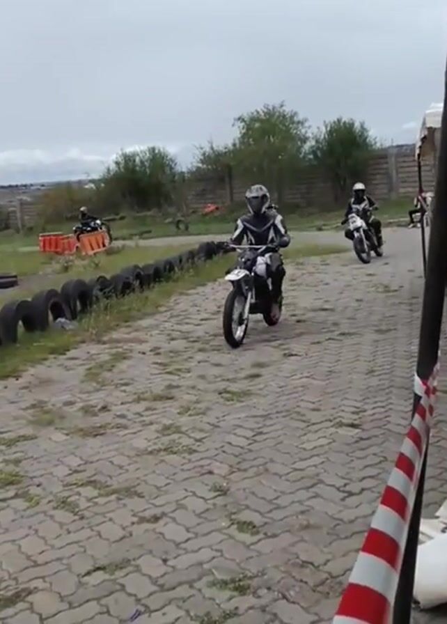 three people riding motorcycles on a paved course. The motorcycles are small and appear to be electric. The riders are wearing helmets and protective gear. The course is marked with tires and red and white striped tape. The environment appears to be an outdoor training facility on a cloudy day.