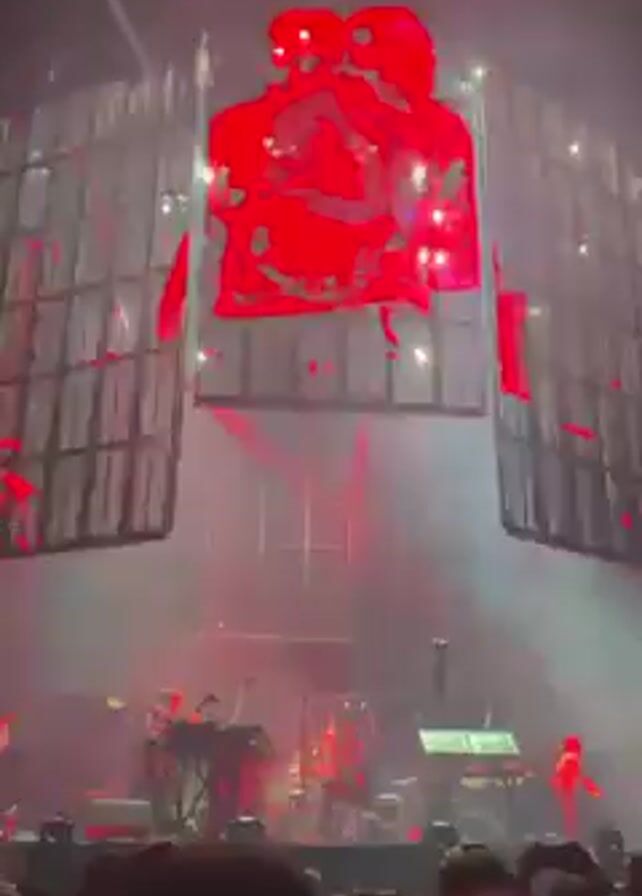 A concert stage is lit with red and green lights. On stage are multiple musicians playing instruments including drums, guitars and keyboards. Above the stage is a large screen divided into panels, displaying changing images, including a person's face. The venue is filled with smoke.