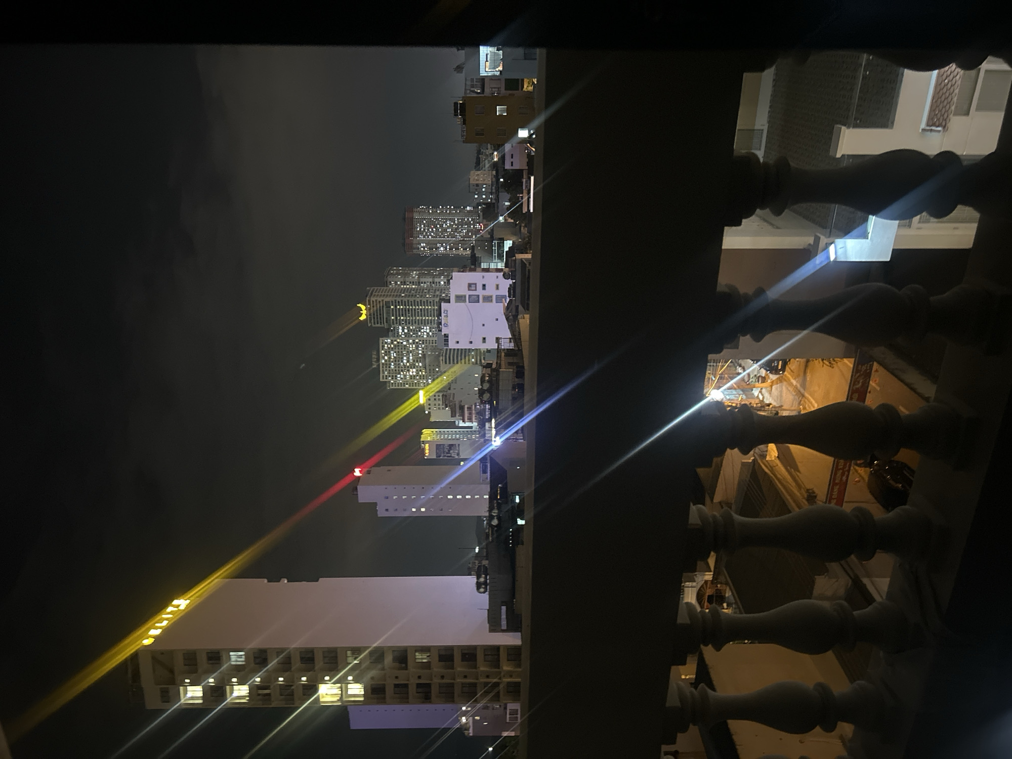 The image depicts a nighttime cityscape from a balcony in Nha Trang, Vietnam. In the distance, lit skyscrapers dominate the horizon, with various colored lights emanating from buildings including yellow, red, and white lights. In the immediate foreground, a balcony railing of turned posts is visible in the lower right. The sky is dark with a layer of clouds visible in the upper left. The city lights create light streaks in the photograph. The overall setting appears to be in the Bac Nha Trang area, based on the architectural style of the buildings. There are no people visible in the image.