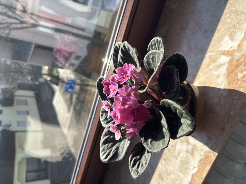 The image displays an indoor scene looking out a window in Rastatt, Germany, focusing on a potted plant on a windowsill. A blooming African violet (Saintpaulia) is centered on a light-colored, veined windowsill, which is illuminated by direct sunlight creating distinct shadows. The plant features numerous fuchsia-pink flowers with yellow centers and dark green, ovate, slightly fuzzy leaves, contained within a brown pot resting on a matching saucer. The window frame is dark brown. Through the window, a blurry street scene is visible, dominated by multi-story buildings, including one with a light green/beige facade and another white structure. Bare trees line the street, and a blue traffic sign is discernible on the right side. Strong glare and reflections on the window glass partially obscure the outdoor view. No individuals are visible.