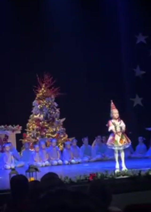 ballet performance. A young girl in a colorful harlequin-style costume with a pointed hat is dancing center stage. Behind her are other young girls in light blue outfits sitting on the stage floor. To the left of the dancers is a fully decorated Christmas tree with lights. In the background, there's a dark blue curtain with white stars on it. In the foreground, the heads of audience members can be seen. The stage is illuminated by spotlights.