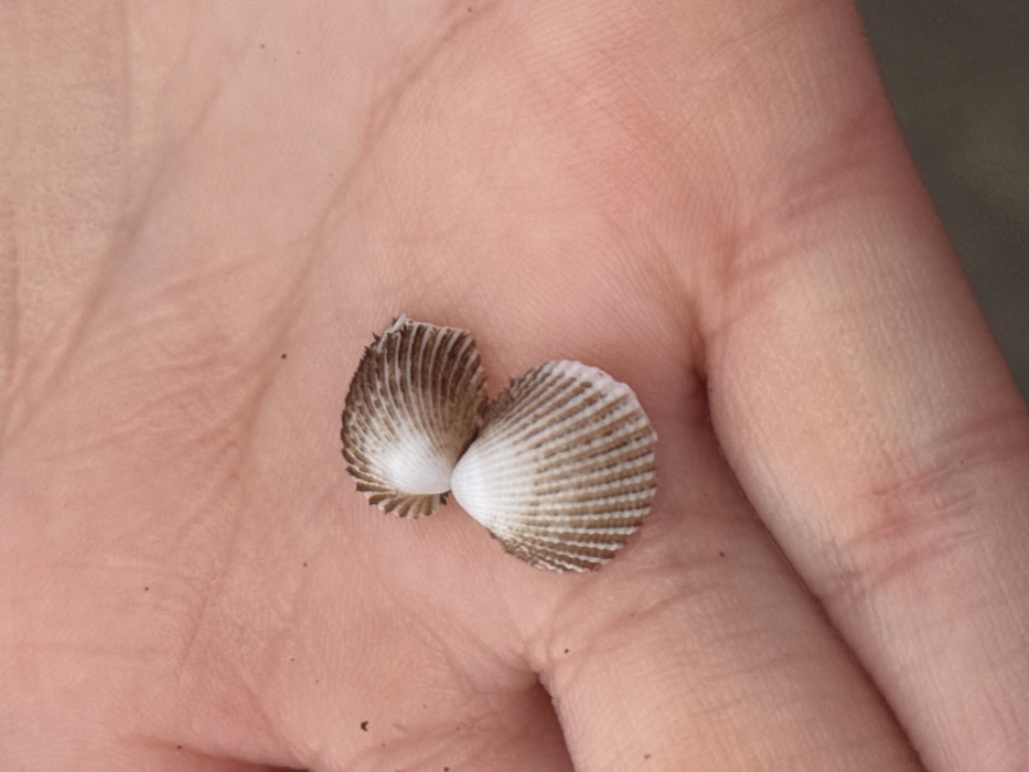 A light-skinned human palm is centrally positioned, oriented with fingers pointing towards the top of the frame. The palm exhibits natural skin creases and several small, dark particulate specks, possibly sand or dirt. Resting on the palm are two small, ribbed bivalve shell valves, identified as a type of cockle. The upper shell valve, approximately 1.5 cm in width, is off-white with distinct brown radial stripes and appears to have a slightly irregular or worn dorsal edge. The lower shell valve, slightly larger at approximately 2 cm in width, is also off-white with brown radial stripes and appears more intact. The shells are positioned in a slight overlap, with the lower shell partially obscuring the ventral margin of the upper shell. The background is out of focus, indicating a shallow depth of field, consistent with the scene being observed at close range in Antón Lizardo, Mexico.