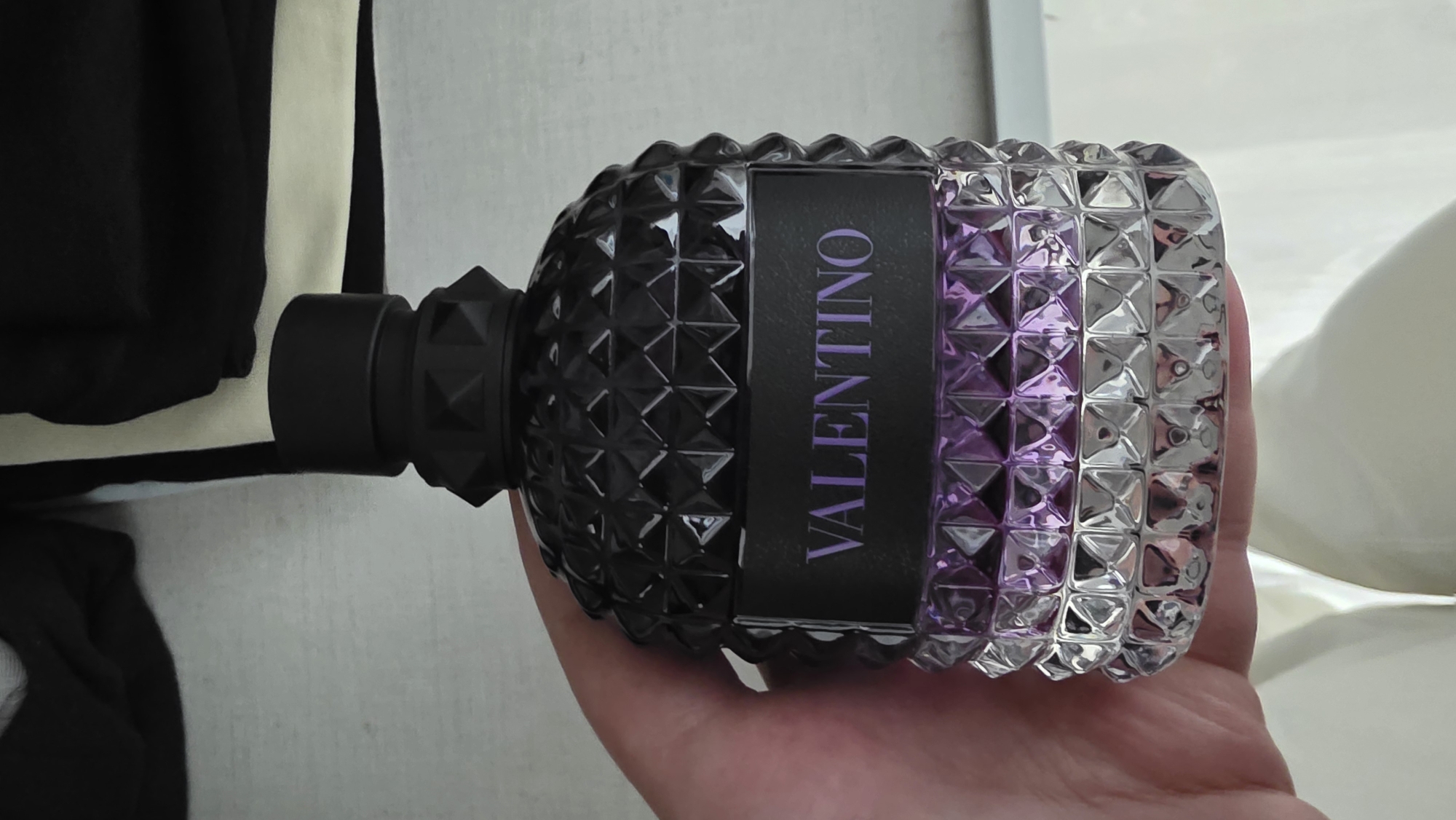 A hand holds a partially purple and clear studded bottle of Valentino perfume against a background of off-white fabric and a garment with black and white sections