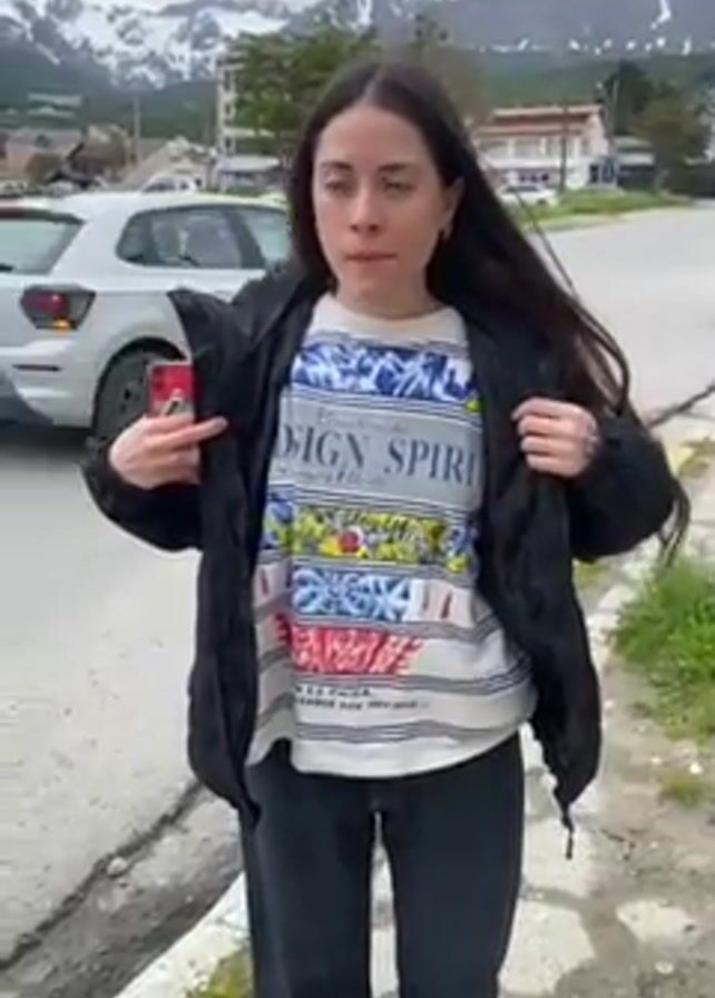 A woman stands outdoors, partially zipping up a black puffer jacket. She has long, dark hair and wears a long-sleeved patterned shirt with the word "DESIGN" visible. She also wears black pants. Behind her is a road and parked cars. In the background are snow-capped mountains and a few houses. The sky is overcast.