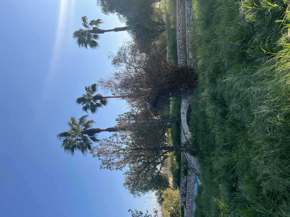 The image depicts an outdoor park or green space within the Municipal Unit of Agios Ioannis Rentis, Greece, under clear daylight. A bright blue sky dominates the upper portion, with direct sunlight originating from the upper right, causing a visible lens flare. The foreground is covered by tall, dense, unkempt green grass, suggesting recent growth or minimal landscaping. In the midground, a light-colored, single-arch stone bridge spans a shallow, dry depression or channel, with its structure partially obscured by the foreground grass. Adjacent to the bridge, terraced stone retaining walls are visible, forming part of the landscape architecture. To the immediate left of the bridge, a section of a dry water feature or basin with blue and white tiled or painted surfaces is present. The midground and background feature abundant vegetation. Three prominent palm trees with full green fronds stand tall against the sky. Various other trees and shrubs are scattered throughout, including smaller evergreen trees and a large, dense, dark-brown shrub in the central midground, which appears dormant or dry. No individuals, animals, or vehicles are present in the scene.