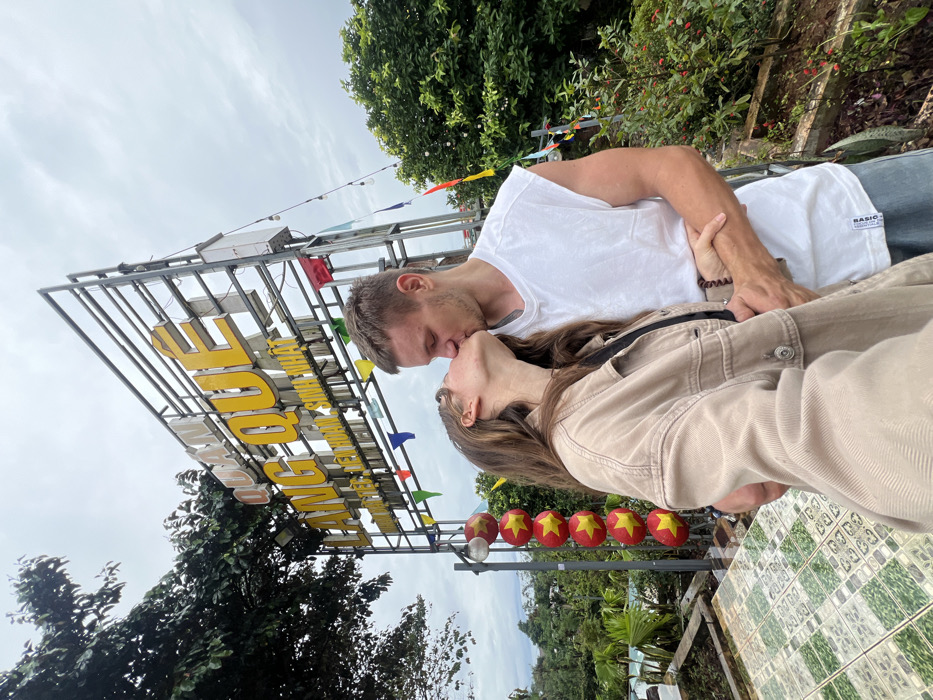 A couple is kissing in front of a large sign that reads "Lang Que". The man is wearing a white tank top and jeans, while the woman is wearing a beige jacket. The sign is decorated with colorful flags and lanterns. Behind the sign, there are trees and a cloudy sky. The foreground features a tiled surface. The image is taken at an angle, appearing tilted.