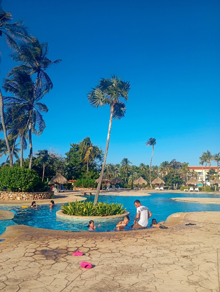 A vibrant scene unfolds at a tropical resort pool. Palm trees frame a bright blue sky above the winding pool. Children splash and play in the water, overseen by an adult in a white shirt. Thatched-roof structures dot the background along the pool's edge. Pink sandals rest on the paved pool deck. The atmosphere is sunny and relaxed, capturing a joyful vacation moment.