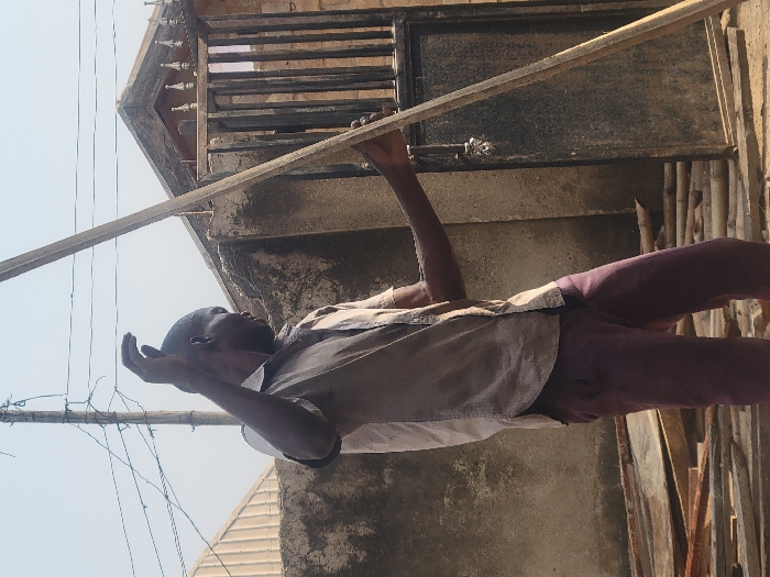 A man in a light-colored shirt and maroon pants is positioned outside, holding a long, thin wooden plank above his head. He is looking upwards, with one hand extended in a gesture. He appears to be working on a metal gate or structure attached to a concrete building. Electrical wires are visible in the background against a light blue sky. Additional pieces of wood are stacked nearby.