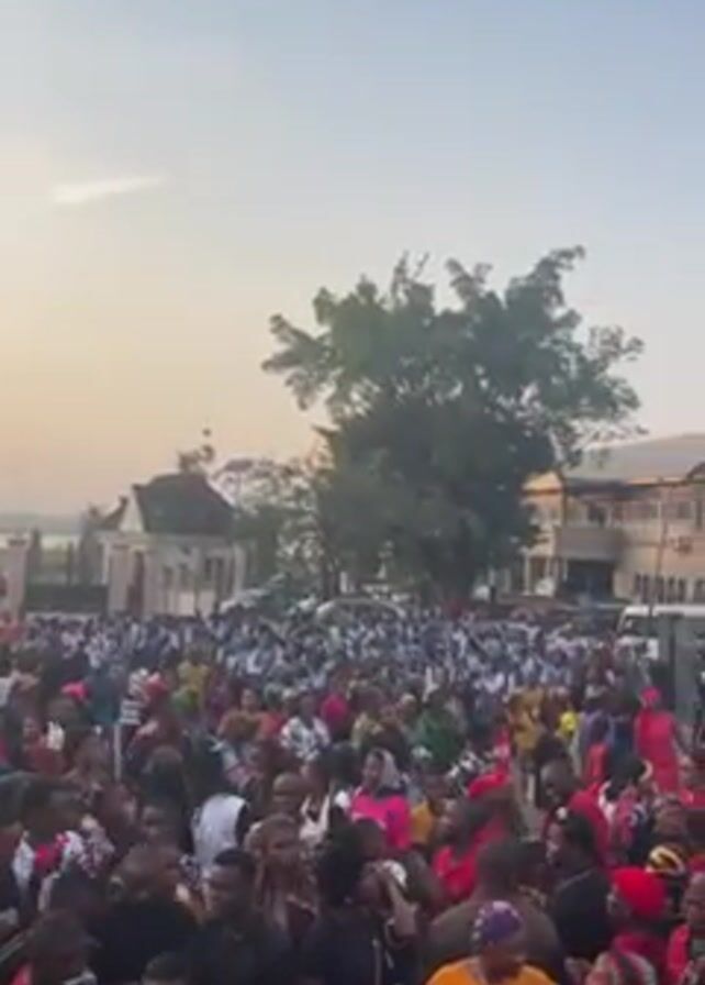 large crowd of people gathered in an outdoor space. The crowd appears to be mainly composed of adults of varying ages, with diverse attire, including red tops and traditional African clothing. There are buildings and trees visible in the background, with a somewhat hazy sky overhead. Some people are holding up their phones, possibly recording or taking pictures. There's rhythmic drumming and singing that suggest a celebration or cultural event. The crowd is tightly packed, making it difficult to discern individual actions, but overall, the scene conveys a sense of communal gathering and festivity.