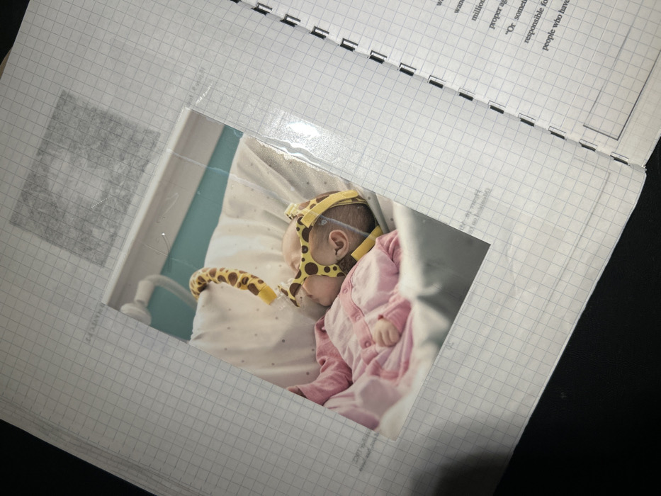 An opened notebook displays a photograph. The photo depicts a baby wearing a giraffe-patterned medical mask, lying in what appears to be a hospital bed. The baby is dressed in a pink outfit, and a giraffe-shaped plush toy is also present. The notebook has graph paper sheets, with the photo adhered to one page. Another page shows printed text. The surrounding background is a dark surface.