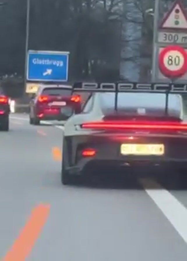 A medium shot from a low angle shows the rear of a dark gray Porsche driving on a gray asphalt road, with a red car trailing behind. The Porsche has a prominent wing with "PORSCHE" in white lettering across the top. The car's red taillights are illuminated. The license plate is partially visible, reading "ZH 90557 U". Road markings, including white lines and an orange stripe, are visible on the road. Overhead, a blue road sign points to "Glattbrugg". There are trees in the background, and streetlights are visible on the side of the road. The video is taken from inside another vehicle, with the dashboard partially visible at the bottom of the frame.