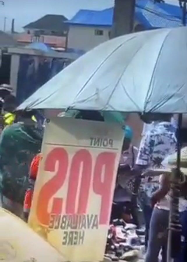 The video depicts a bustling outdoor marketplace with numerous individuals browsing and interacting with vendors. The scene is filled with clothing displays and a variety of stalls. A sign reads "POS AVAILABLE HERE." An umbrella provides shade over the POS service. The weather appears bright and sunny.