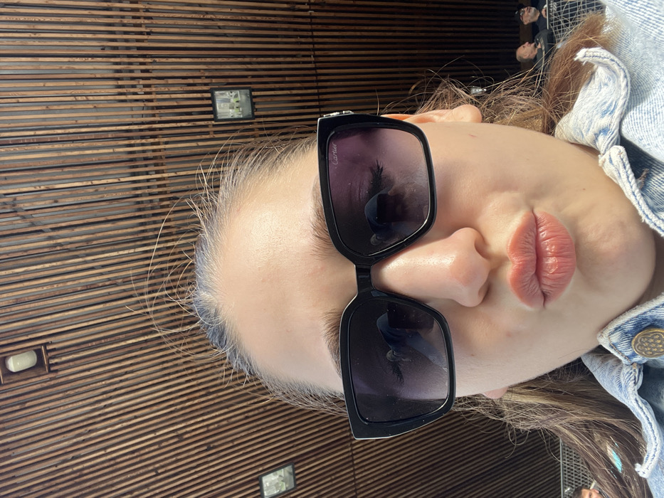 A close-up, low-angle selfie depicts a female individual centered in the frame. Her head is tilted slightly upwards, and her lips are pursed in a "kissing" gesture. She wears large, black-framed "Cartier" branded sunglasses with gradient dark lenses, reflecting indistinct shapes. Her hair, dark brown and pulled back, shows several fine flyaways around the forehead. She is dressed in a light blue denim jacket, with a brass-colored button visible on the right collar. The background consists of a ceiling or overhead structure composed of numerous closely spaced, vertical wooden slats, creating a ribbed texture. Integrated into this structure are at least two oblong, ceiling-mounted light fixtures. On the upper right, a small, framed image or sign is affixed to the wooden slats, displaying a faint scene. In the lower right background, behind the subject's shoulder and partially obscured by a wire mesh or railing, two adult males are visible. They appear to be seated, facing away from the camera, with one wearing a dark cap. The image provides no discernable visual cues to confirm the specific location as Oberhausbergen, France.