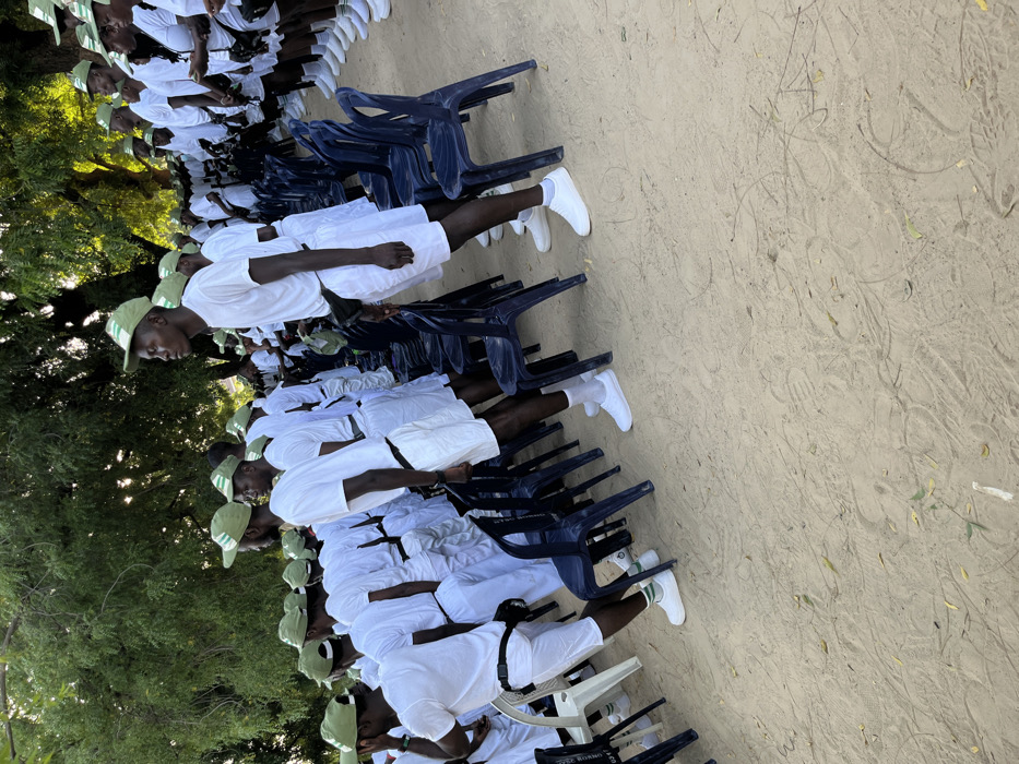 An outdoor scene in Maiduguri, Nigeria, displays a large formation of young adults, predominantly male, standing in ordered rows on a light brown, sandy ground
