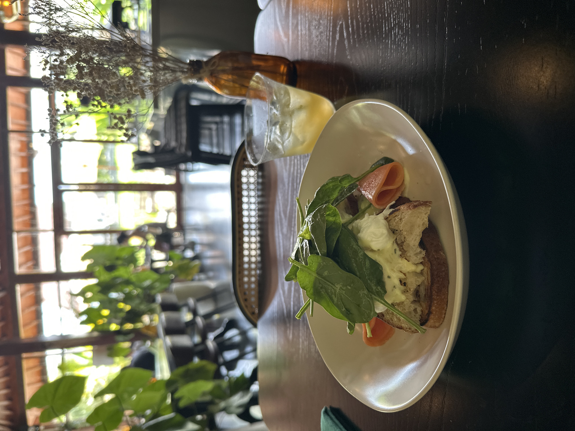 The image depicts a meal served on a dark wooden table within an indoor dining establishment in Canggu, Indonesia. In the foreground, a white oval plate holds a slice of toasted bread topped with a white creamy substance (likely a poached egg or sauce), fresh green spinach leaves, and two rolled slices of orange-colored food. To the right of the plate, a clear glass contains ice and a light yellow beverage. Further right and slightly behind, an amber-colored glass vase holds dried light-colored botanicals. A folded green napkin is partially visible on the table to the left of the plate. The midground and background are out of focus but reveal a brightly lit interior space with large windows or glass doors framed by brown wood. Above, a wooden ceiling structure is visible. Numerous green, large-leafed plants are present throughout the space, suggesting an indoor-outdoor aesthetic. Dark chairs and tables are scattered, and at least two blurred human figures are discernible in the background, seated or standing, indicating patrons. One distinct figure is seated in profile, facing right, near a window. A rattan-backed chair is visible to the left of the plate, suggesting the seating arrangement. Natural light enters predominantly from the background windows.