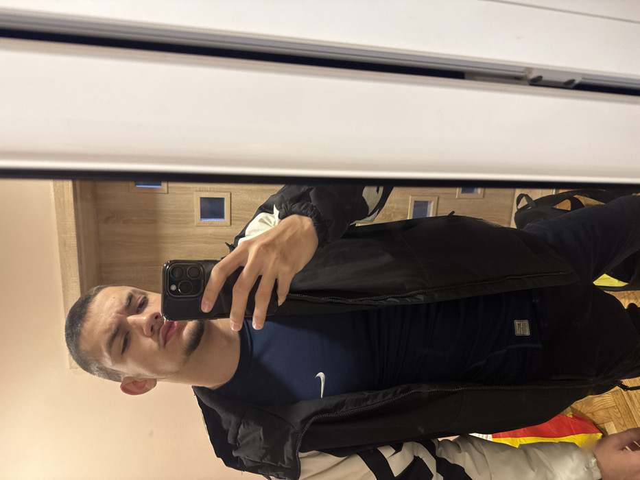 A young adult male is captured in a mirror selfie, standing indoors. He has a short, buzzed haircut and light facial stubble. He is wearing a dark blue long-sleeved athletic shirt with a white Nike swoosh logo on the chest, underneath a partially unzipped black and beige/white hooded jacket. Dark-colored pants are visible below the jacket. He holds a black smartphone, featuring a triple-lens camera system, in his right hand, angled to photograph his reflection. His lips are pursed, and his gaze is directed towards the camera. The mirror itself has a white frame along its right edge. The background, visible in the mirror's reflection, includes a plain light-colored wall and a light wooden door with two square, dark-colored inserts. A yellow object and a dark backpack are partially visible on a light-colored floor in the lower sections of the reflection. The depicted environment is an interior space, likely residential, and contains no discernible features to identify a specific location within the city of Shumen, Bulgaria.