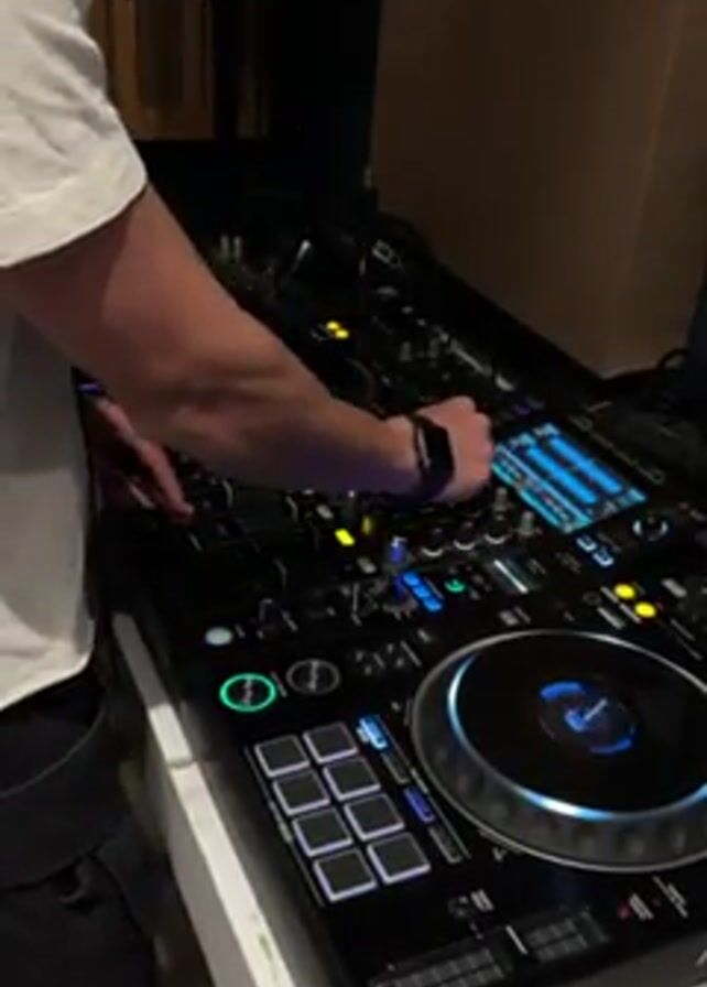 A DJ in a white t-shirt is working at a Pioneer DJ setup in a dim room