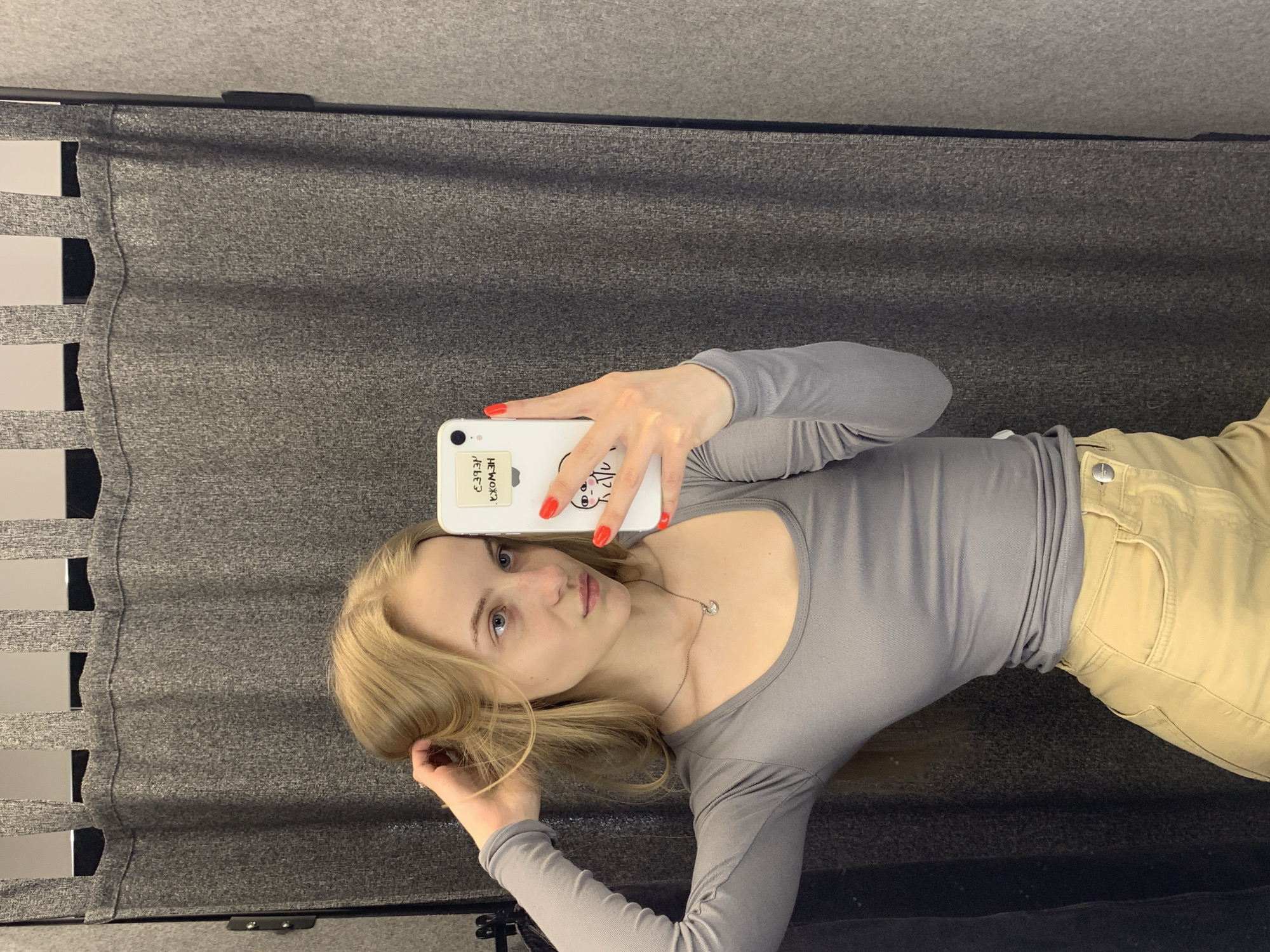 A blonde woman is taking a selfie with her phone in what appears to be a dressing room. She is wearing a grey long-sleeved shirt and tan pants. The dressing room has a grey fabric background and white slat walls on the left. The text on the phone case appears to be reversed. There is no indication of the city of Kyiv, Ukraine.