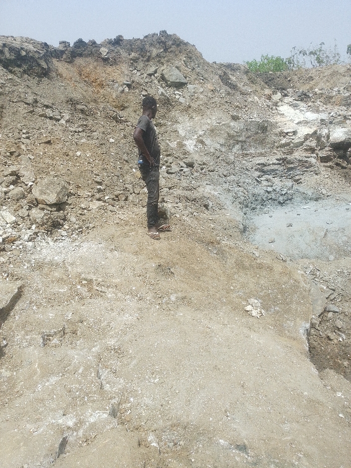 This image depicts an arid, excavated landscape in Otulu, Nigeria. An adult male, of dark complexion and short dark hair, stands prominently in the mid-ground. He is dressed in a dark, short-sleeved shirt, dark trousers, and light-colored open-toed sandals. His hands are placed on his hips or in his pockets, and he is positioned in a profile view, looking towards the right side of the frame. The immediate foreground and mid-ground consist of light-colored, dusty, uneven terrain with scattered small rocks and debris. Behind the individual, a steep, extensive slope rises, composed of disturbed earth, loose rocks, and larger geological formations in various shades of brown, grey, and off-white. A distinct area on this slope, to the right of the male subject, features a prominent bluish-grey mineral deposit or rock layer. On the upper right section of the distant slope, a small patch of sparse green vegetation is visible. The sky is light, appearing hazy or overcast, suggesting an outdoor daylight scene. No other individuals or man-made objects are identifiable. The male subject's action is observing the surrounding geological features.