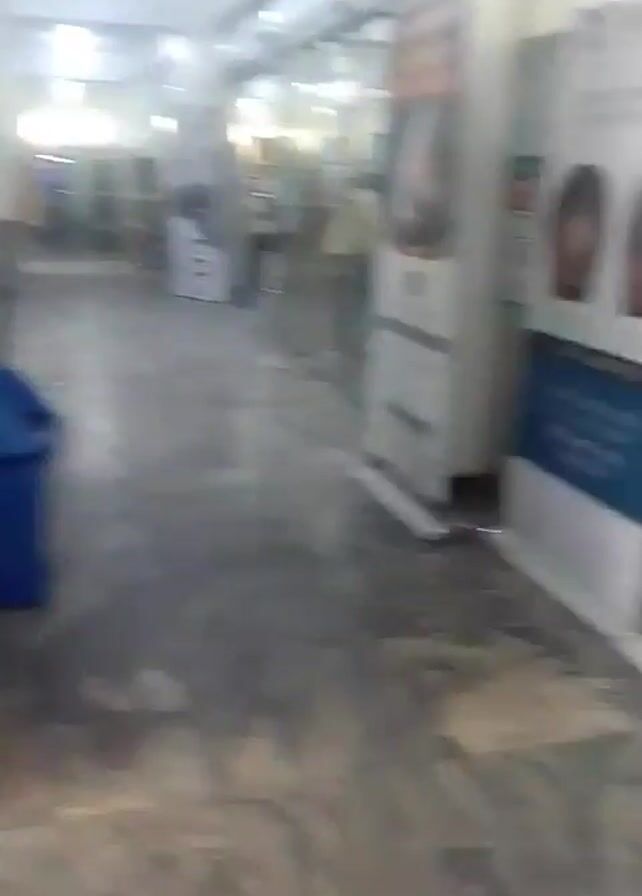 hallway lined with promotional banners. The camera pans from left to right, showing various banners promoting organizations and services. One of the banners visible advertises "BATIJAY TRAVELS LIMITED" and includes logos of several airlines such as Arik Air, RwandAir, Air France, KLM, British Airways, and Qatar Airways. The environment appears to be an indoor space with a polished floor, likely a commercial or public building. There are no people clearly visible in the video. The focus is solely on the informational displays.
