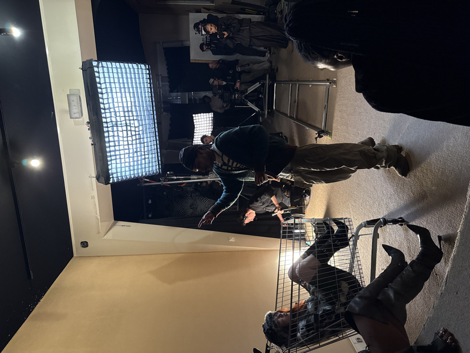 A film set depicts a woman in a cage-like structure on wheels. A man points in her direction, possibly directing the scene. Behind him, more crew members are visible, including a person operating a camera on a tripod. A large lighting panel illuminates the scene. The set features a combination of dark and light-colored walls.