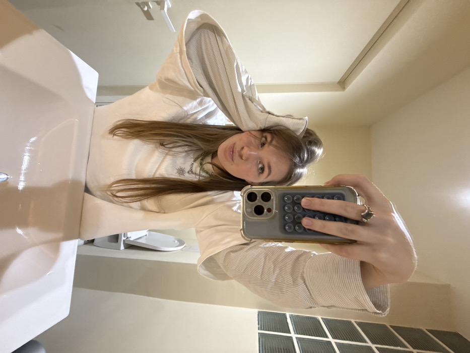 A young woman with light brown hair and green eyes takes a selfie in a bathroom
