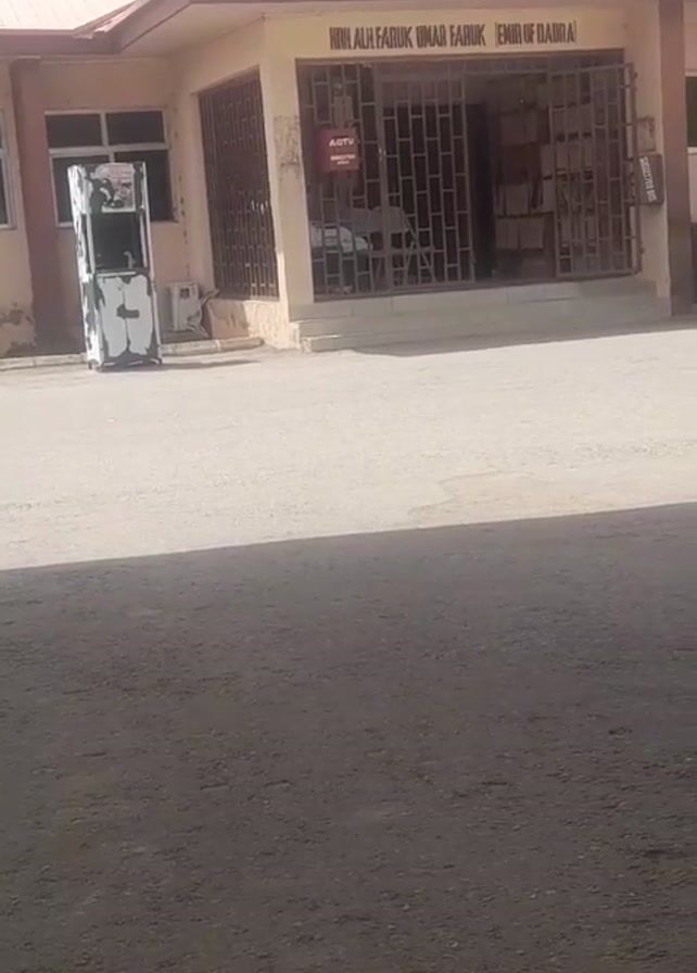 building with the sign "HHH ALI FARUK UMAR FARUK EMIR OF DAURA". The building is single-story, with a light-colored exterior and a reddish roof. It has barred windows and a gate in the front. There is a beverage cooler or vending machine to the left of the entrance, and a motorcycle is parked to the right. The ground in front of the building is paved. The video is somewhat shaky and appears to have been taken from a vehicle. The light suggests it is daytime. The environment is generally quiet and there are no visible people.