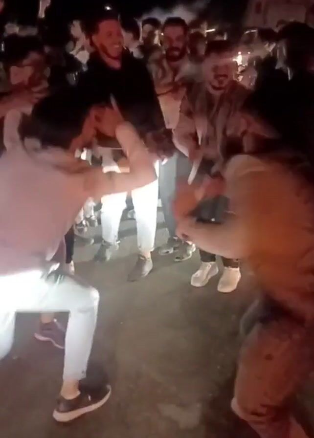 large group of people dancing together at night. They appear to be in an outdoor area, possibly a street or parking lot. The people are dressed in various casual clothing. There is bright light shining into the camera lens, which causes some glare on the video. The overall mood seems festive and celebratory.