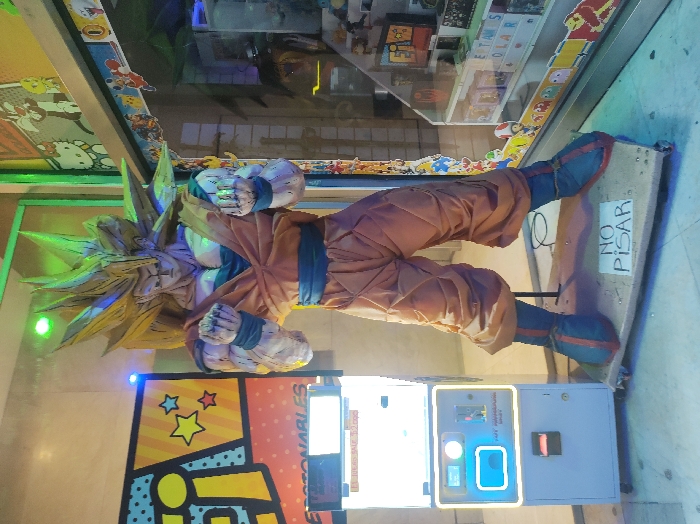 A figure of Goku lies on a wooden base, with a sign that says "No Pisar". The statue is in front of an arcade machine with colorful graphics on its side. Above the statue, there is a glass enclosure filled with various items, including toys and collectibles. The statue and arcade machine are set on a tile floor.