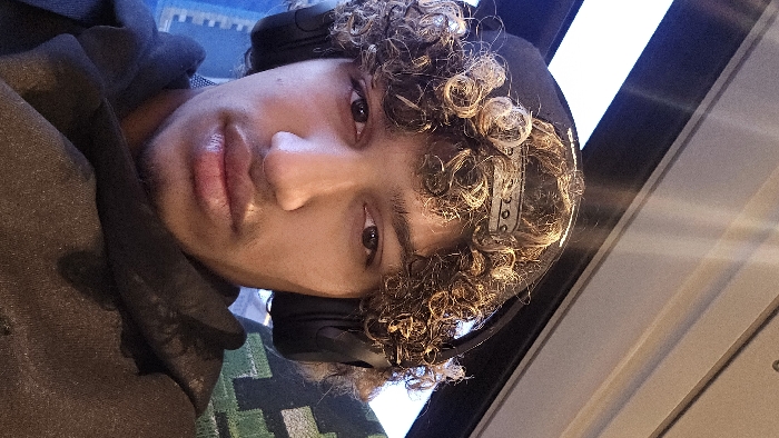 The image displays a male individual, appearing to be in his late teens or early twenties, captured in a close-up, head-and-shoulders perspective