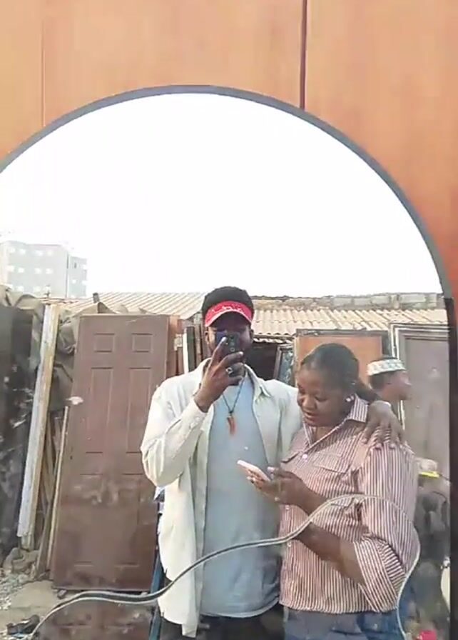 A man and a woman are standing together in front of a large, circular mirror. The man is holding up his phone and taking a picture of them in the mirror. He is wearing a white overshirt over a grey t-shirt, black shorts, a red visor, and a necklace with a pendant. The woman is wearing a red and white striped shirt and blue jeans and holding a pink phone. She is smiling and looking at her phone. The background behind them appears to be a cluttered outdoor area with various discarded items and buildings in the distance.