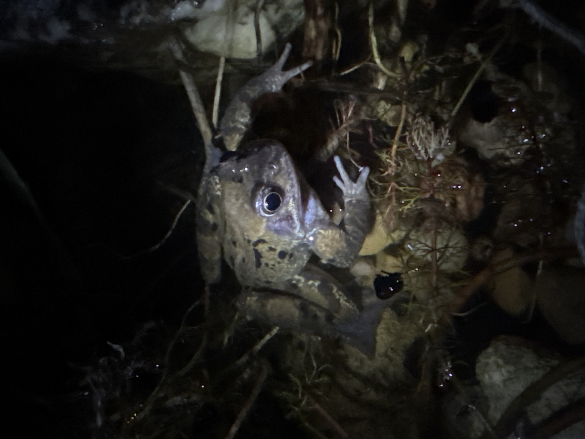 A frog is sitting in shallow, dark water amid plant debris and stones. The frog is light brown with dark spots and its front legs are raised, with its feet visible. The environment is dark and possibly natural, with limited ambient light. The location in South Kesteven, United Kingdom cannot be determined from the image.