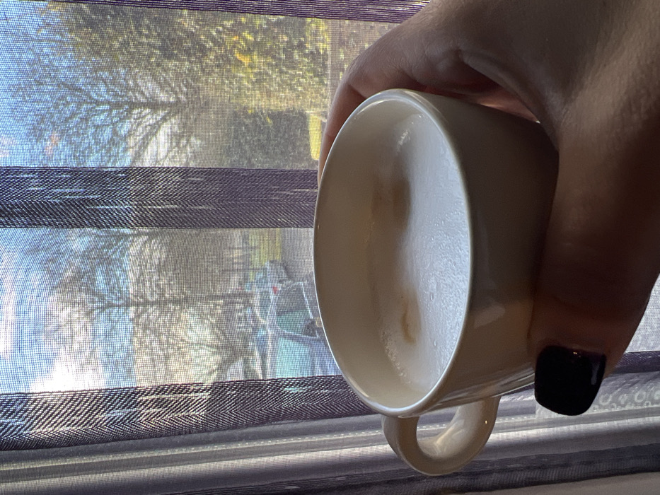 A right human hand, with a dark-painted thumbnail, holds a white ceramic cup containing a light brown, foamy beverage