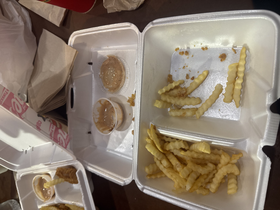 The image displays a high-angle view of a dark wooden table surface, featuring partially consumed fast-food items and associated packaging. Three open white styrofoam take-out containers are present. The uppermost container, partially visible on the left, contains crinkle-cut French fries, one chicken tender, and a small plastic cup holding light brown dipping sauce. The central container is largely empty, containing two small clear plastic cups; one holds a small amount of light brown sauce, and the other shows only residual sauce. The lowermost container is compartmentalized; its left section is filled with crinkle-cut French fries, while the right section contains a few scattered crinkle-cut fries and food crumbs. In the background, crumpled brown paper napkins are visible, along with a partially obscured red beverage cup and white paper packaging featuring prominent red "Cane's" branding. The scene is consistent with a dining area within a Raising Cane's Chicken Fingers restaurant or premises where its food is being consumed in Austin, Texas, United States of America. No individuals are visible.