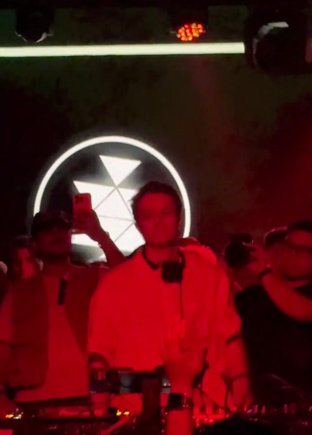 A DJ in a white short-sleeved shirt and headphones is surrounded by a crowd taking pictures and waving their hands in the air. The DJ is working at a DJ station, and there's a large illuminated geometric symbol behind him on a screen. The lighting is primarily red, but it changes to white and violet during the video. The setting appears to be a nightclub or music venue.