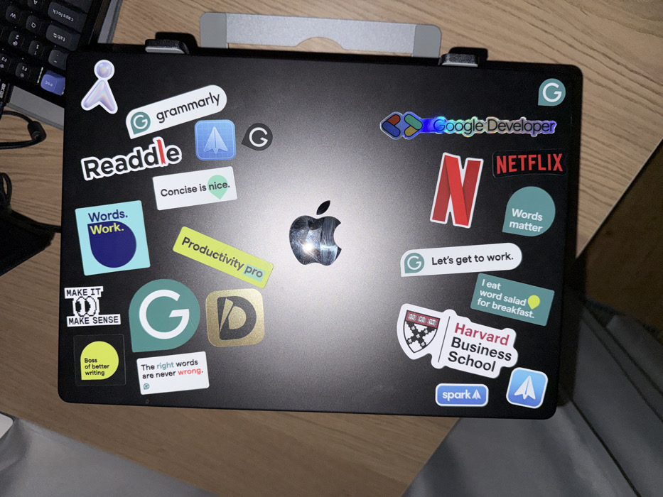 A black laptop displays an illuminated Apple logo amidst a collage of stickers. These include logos for Grammarly, Readdle, Google Developer, Netflix, and Harvard Business School. Text-based stickers read phrases like "Concise is nice," "Productivity pro," "Words matter," and "Let's get to work." Other stickers feature stylized text and logos like "Words. Work," "MAKE IT MAKE SENSE," and a general Google logo. The laptop sits on a wooden surface alongside a keyboard.