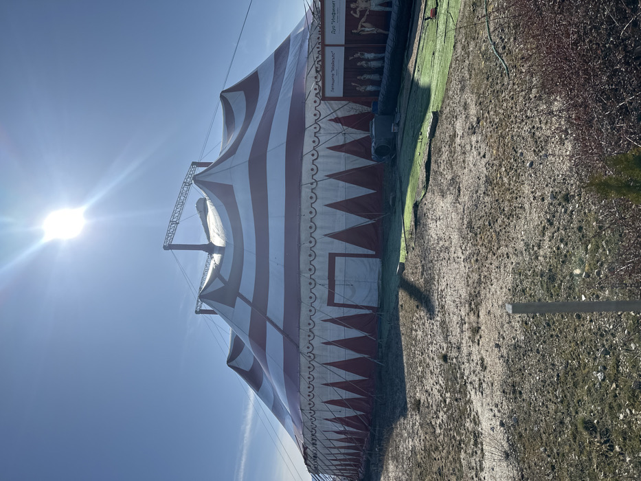- "A large circus tent, featuring prominent red and white horizontal stripes on its main canopy and triangular patterns on its lower sidewall, is erected on uneven, gravelly ground in Velingrad, Bulgaria" by FM-RdqQr2, licensed under CC BY 4.0