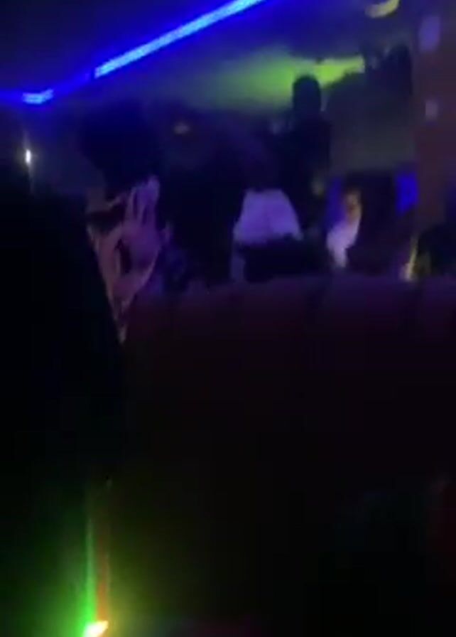 group of people inside a dimly lit nightclub or bar. The lighting is provided by strip lights, alternating between blue and green. The people are standing and talking, and one person appears to be holding a bottle. There are dark green padded benches lining the wall. A fan is mounted on the ceiling.
