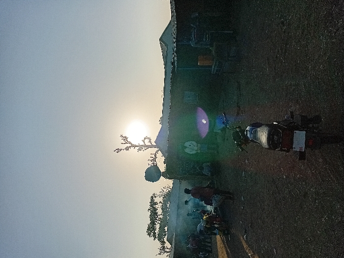A sunny outdoor scene features a low building with visible furniture. A motorbike is parked nearby. In front of the building, a group of people gather around what appears to be a cooking fire with smoke rising. A decorative tree-like structure stands near the building, backlit by the sun. The sky is bright, and the ground appears to be a dirt or gravel surface.